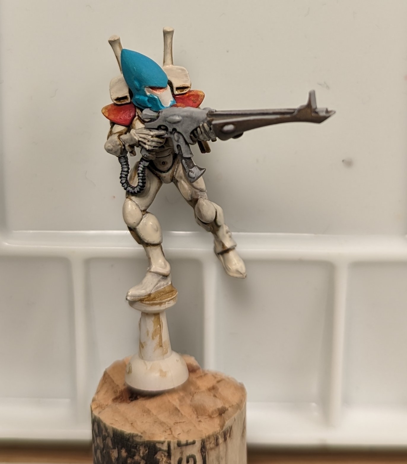 I didn't have the nicest color scheme to work with, but I think I made due. I wish the chest was a bit more visible on the finished model, but you can still make out the white on the tabletop. A good challenge and nice sculpt, I like his backpack's missile reloading arm.